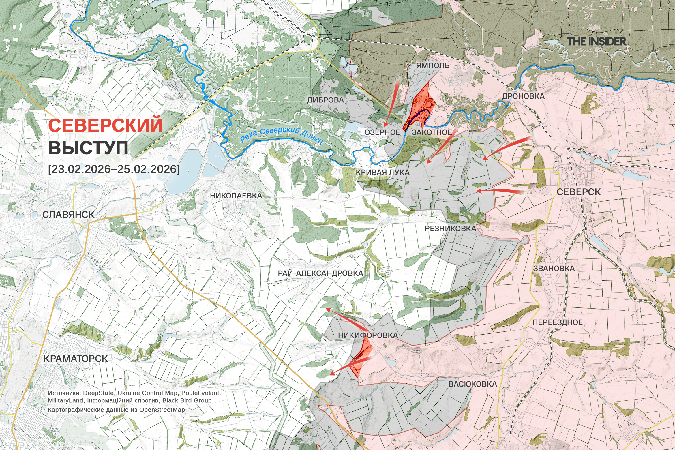 В DeepState отметили продвижение ВС РФ в районе Никифоровки к юго-западу от Северска по направлению на Краматорск. Пророссийский OSINT-ресурс «Сливочный каприз», в свою очередь, зафиксировал расширение российской зоны контроля на 500 м на подступах к Кривой Луке на правом берегу Северского Донца к западу от Северска по направлению на Славянск — к такому выводу в проекте пришли, установив место съемки видео артиллерийского обстрела российских позиций.