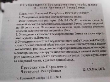 Автор статьи предугадал будущее. Позже, когда исполком ОКЧН в период подготовки первого съезда чеченского народа отбирал эскизы будущего флага, были выбраны именно эти три цвета: зеленый, белый и красный. Почему они. а, скажем, не синий, не желтый, не светло – коричневый или еще какой – нибудь. А все дело в том, что именно в этих трех цветах отразилась вся многовековая история чеченского общества, его обычаи, взгляды на жизнь, мировоззрение.