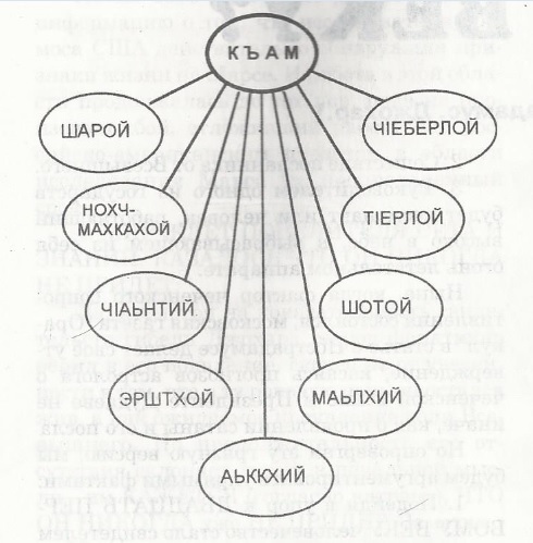 Согласно М.Мамакаеву, в частности, его работе “Чеченский тайп в период его разложения”, это: Нохчмахка-хой, Ч1аьнтий, Эрштхой, Аьккхий, Шарой, Маьлхий, Шотой. Твердой, Ч1ебер-лой. Всю структуру чеченского общества можно представить следующим образом: