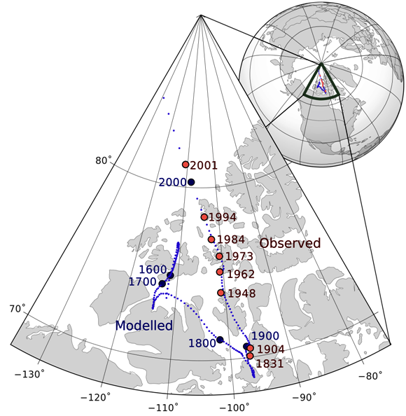 Вспомним, что магнитные полюса не совпадают с географическими. Более того магнитные полюса непрерывно смещаются: